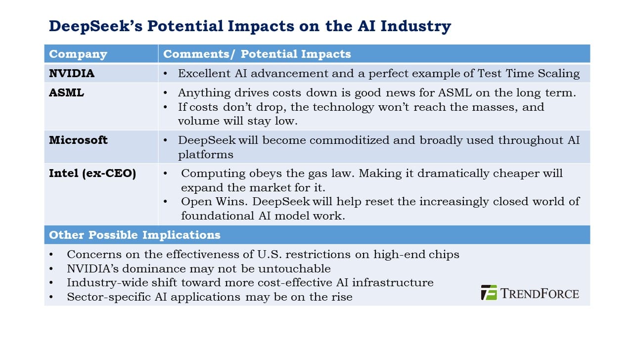 Hoewel DeepSeek nog steeds NVIDIA-chips gebruikt en zal blijven gebruiken, laat het bedrijf zien dat AI-modellen niet per se miljardeninvesteringen vereisen. Dit onderstreept een bredere trend waarbij AI-ontwikkeling zich verschuift naar kosteneffectieve infrastructuur en software-optimalisatie, aldus TrendForce.
