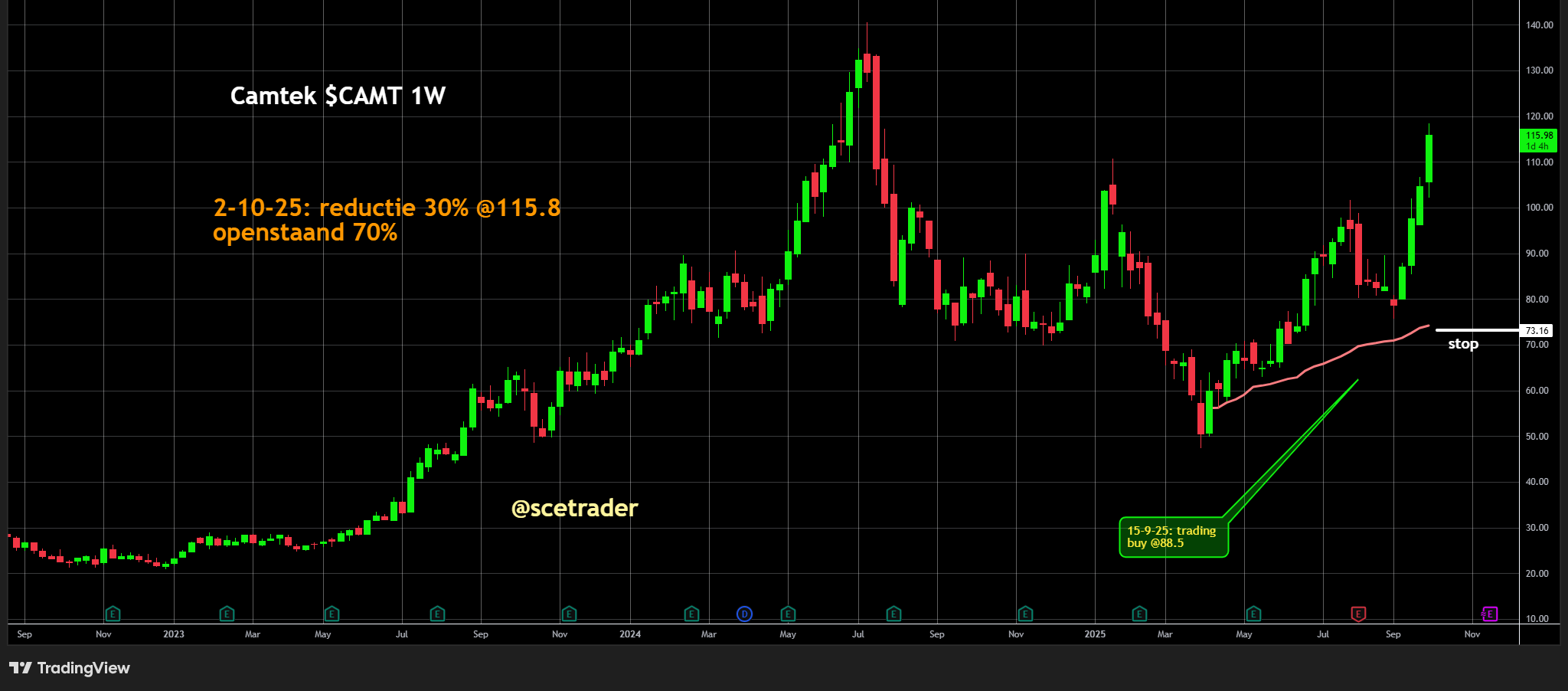 The stock Camtec $CAMT, where we remain bullish, has rallied significantly in recent weeks, prompting us to scale back part of the position. On September 15 we initiated a position at 88.50 dollars, and we are now trimming it down to 70 percent of the original size.