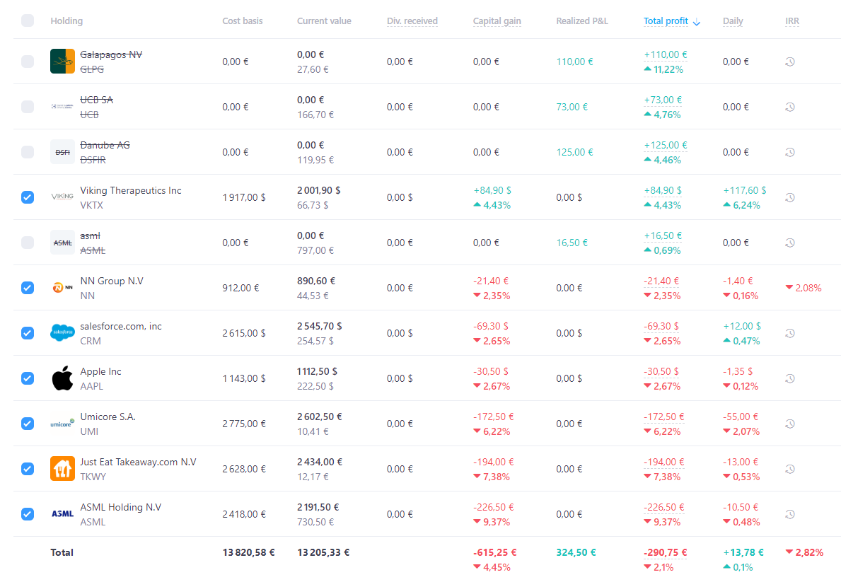 Het kan echter voorkomen dat we bepaalde aandelen langer aanhouden als we dat opportuun achten, hoewel het primair om traden gaat. (Hier staat de uitleg).