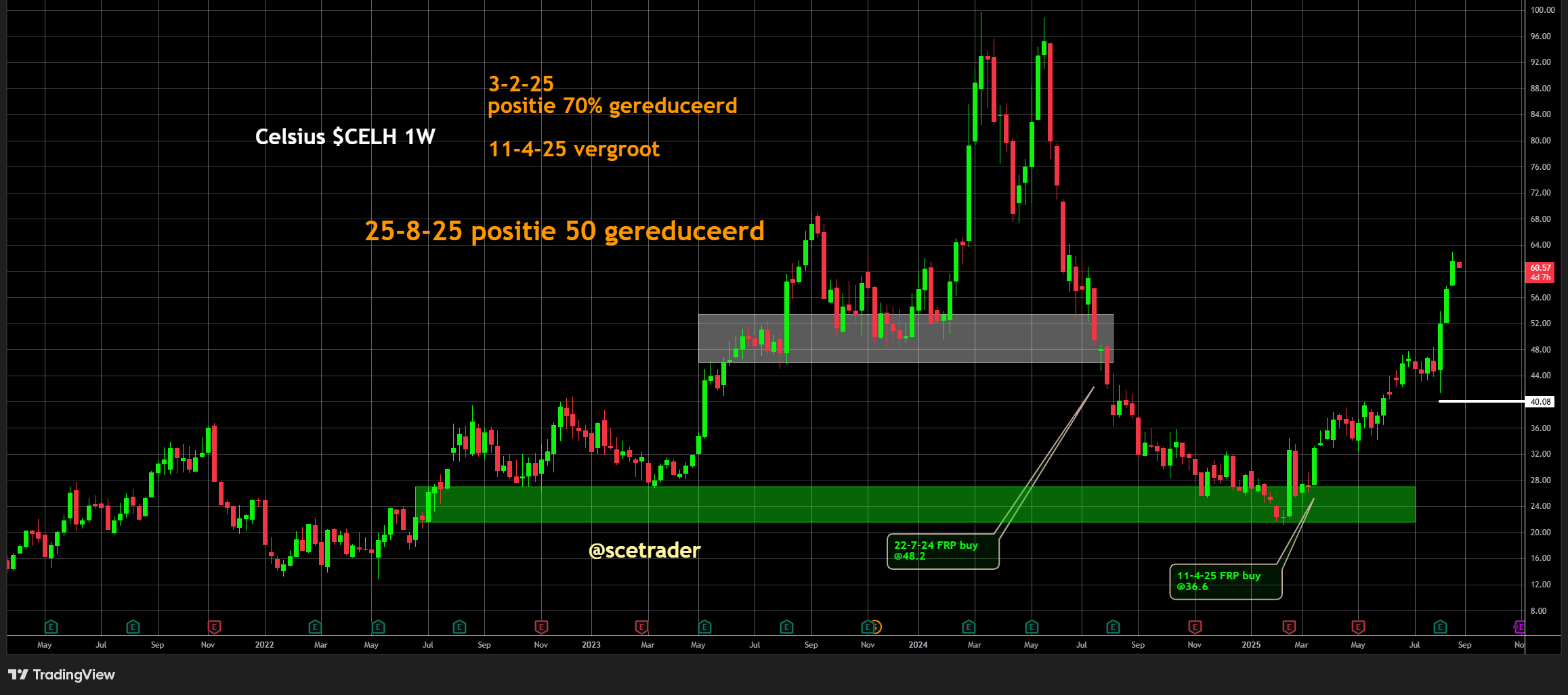 Na deze rally vinden we het verstandig om te verkleinen. Daarom halveren we nu de positie met 50% en hadden al een stop rond de 40 dollar. Daarmee creëren we een free ride.