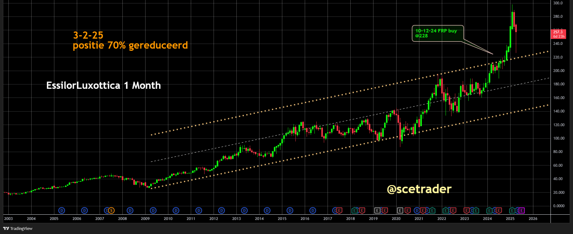 EssilorLuxottica is strategisch goed gepositioneerd voor groei in de komende jaren. Wij blijven op een stijging zitten en overwegen bij een technische pullback serieus groter in te stappen. De combinatie van innovatieve kracht, wereldwijde spreiding en een sterk merkenportfolio biedt een robuuste basis voor verdere waardestijging.