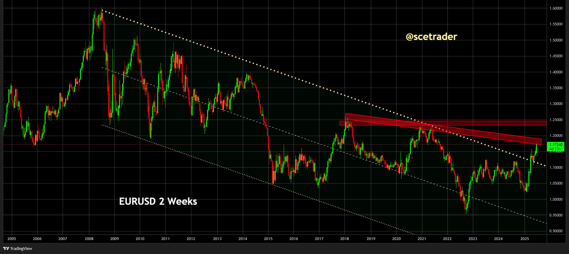 - De zone 1,20–1,25 is al sinds 2018 een sterke weerstand; zonder nieuwe steun kan de euro daar opnieuw op afketsen.