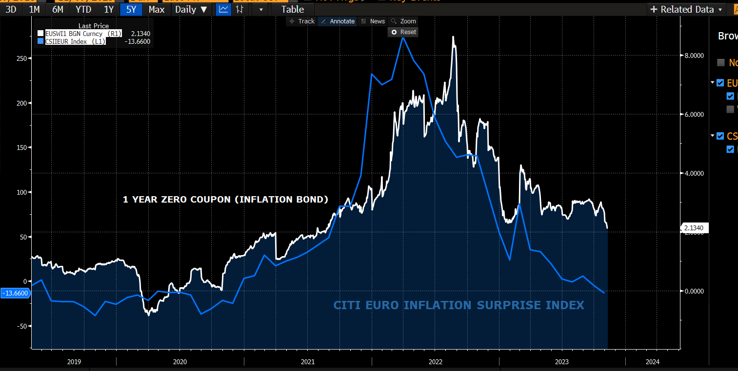 In Europa blijven de verwachtingen over de inflatie op korte termijn dalen. Dit duidt erop dat inflatie momenteel minder als een groot probleem wordt gezien. Bovendien is er een groeiende verwachting dat de rente nog maar beperkt zal worden verhoogd door de ECB.