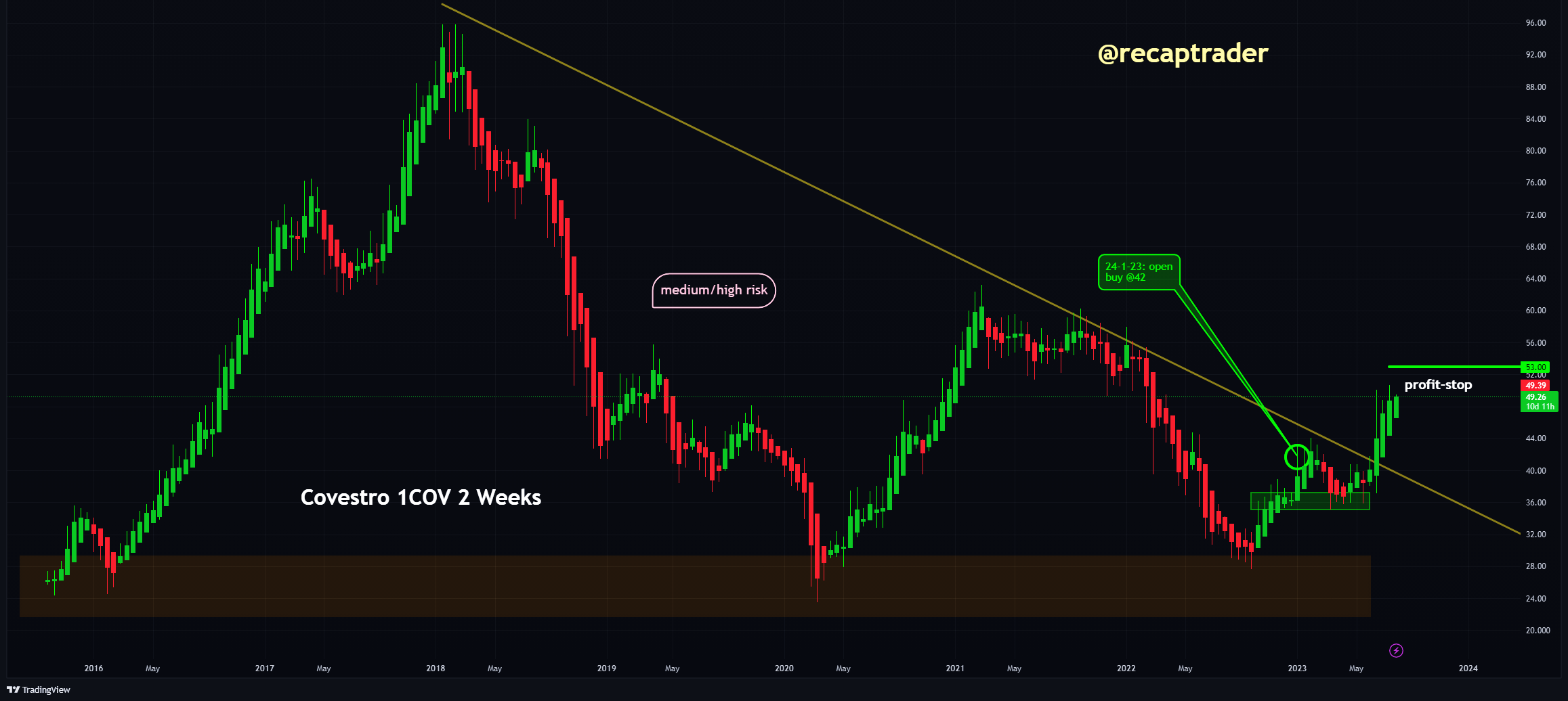 Overigens, de belangrijkste reden dat we long zitten heeft te maken met de speculatie dat Covestro uiteindelijk toch op een overnamebod door ADNOC ingaat. Wij schatten voorlopig in dat dit rond de 57 euro zal liggen. Dit is een getal genoemd door Reuters die onlangs een exclusief rapport had over ADNOC en Covestro.
