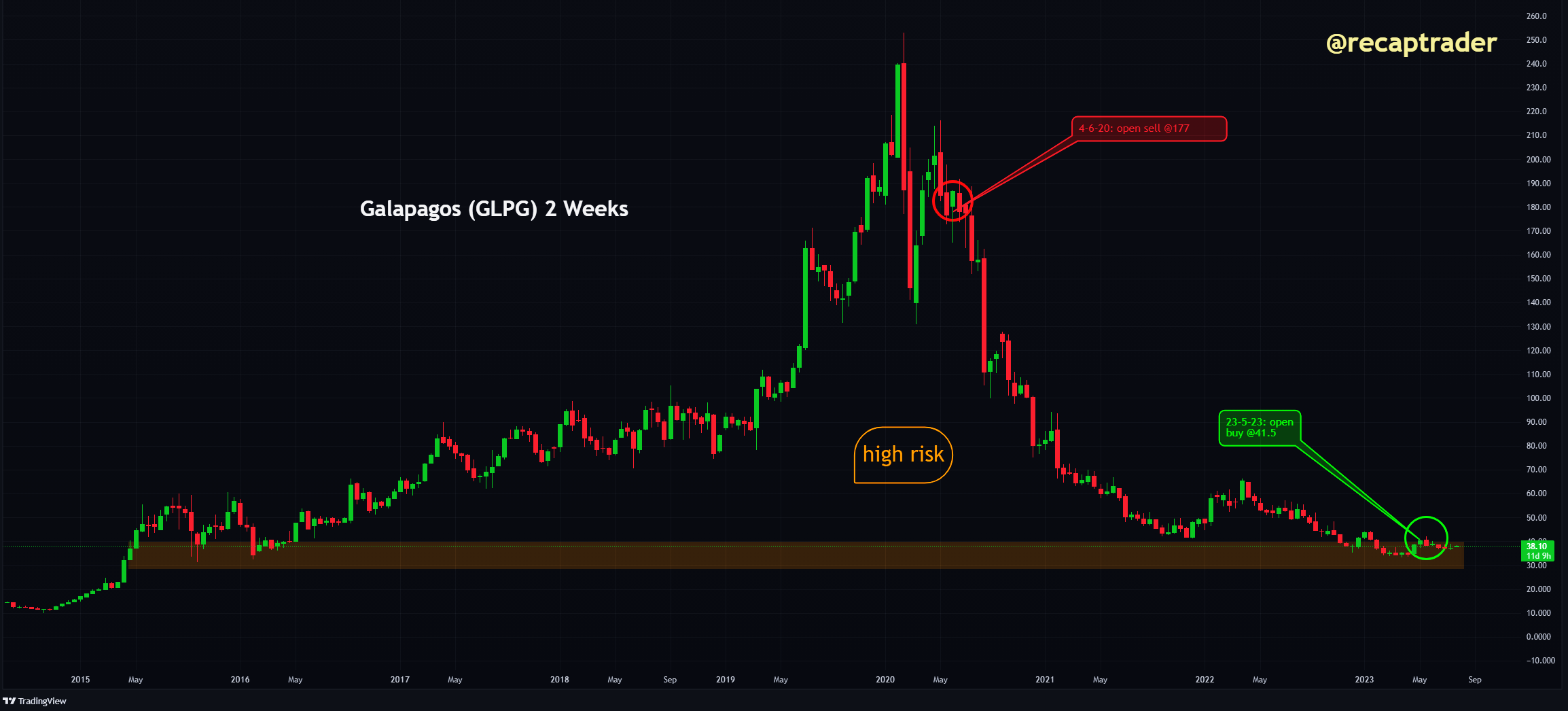 Het aandeel Galapagos $GLPG is binnen de AMX een uitschieter naar boven. Nog niet zo lang geleden hebben we onze visie op het handel gewijzigd van negatief (vanaf rode cirkel) naar positief. Dit een high-risk aandeel.