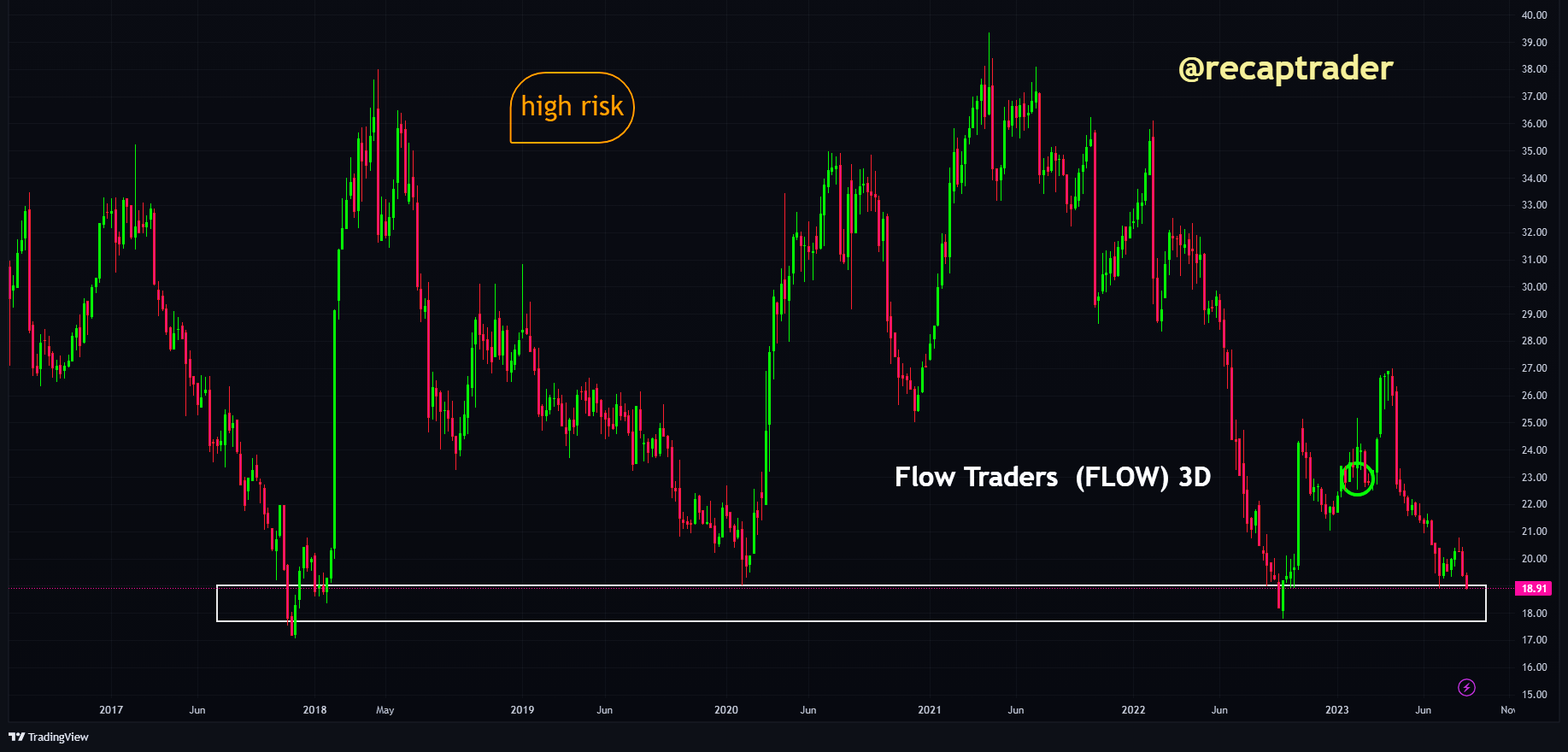 Als wordt gekeken naar de grafiek kan gesteld worden dat er misschien bij een daling naar onder de €17,5 euro een statistische kans is. In de afgelopen jaren was dit een niveau waarop de koers steeds weer opveerde en een stijging van minstens 70% liet zien. Meer kan er momenteel niet van gemaakt worden. Flow Traders komt voorlopig niet voor in de hitparade.
