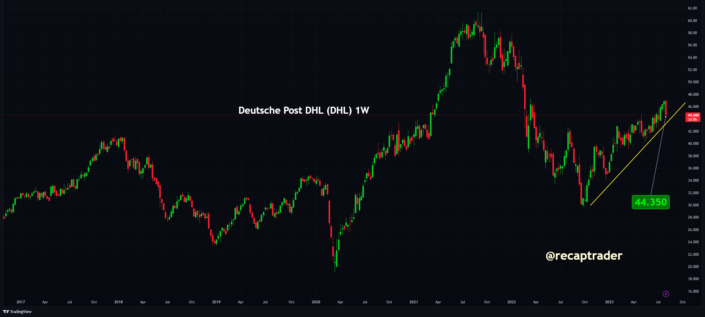We gaan dus over op een trading buy in DHL zonder dat we ook maar enig vertrouwen hebben in de langetermijnperspectieven van dit fonds. Deze trading buy is puur gebaseerd op de prijs gedreven actie van het aandeel en willen we als hoogst risicovol bestempelen. We willen ook direct benadrukken dat als het aandeel terug is bij de top van haar opgaande patroon, we waarschijnlijk weer weg zijn.