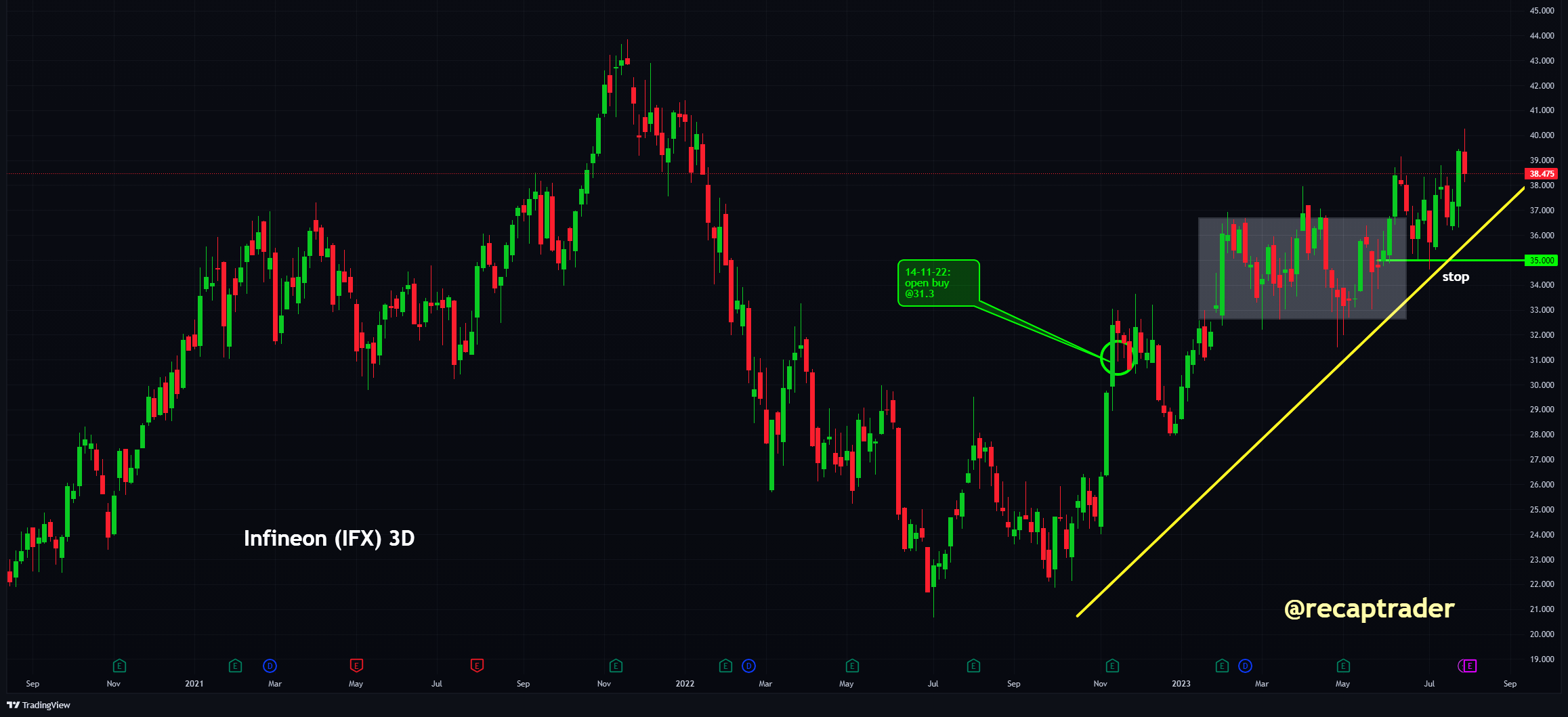 De cijfers zijn geen aanleiding om nu bij te kopen, maar we blijven op een stijging zitten. We zijn ingestapt op 31,3 euro en voor de zekerheid leggen we een stop in op 35 euro.