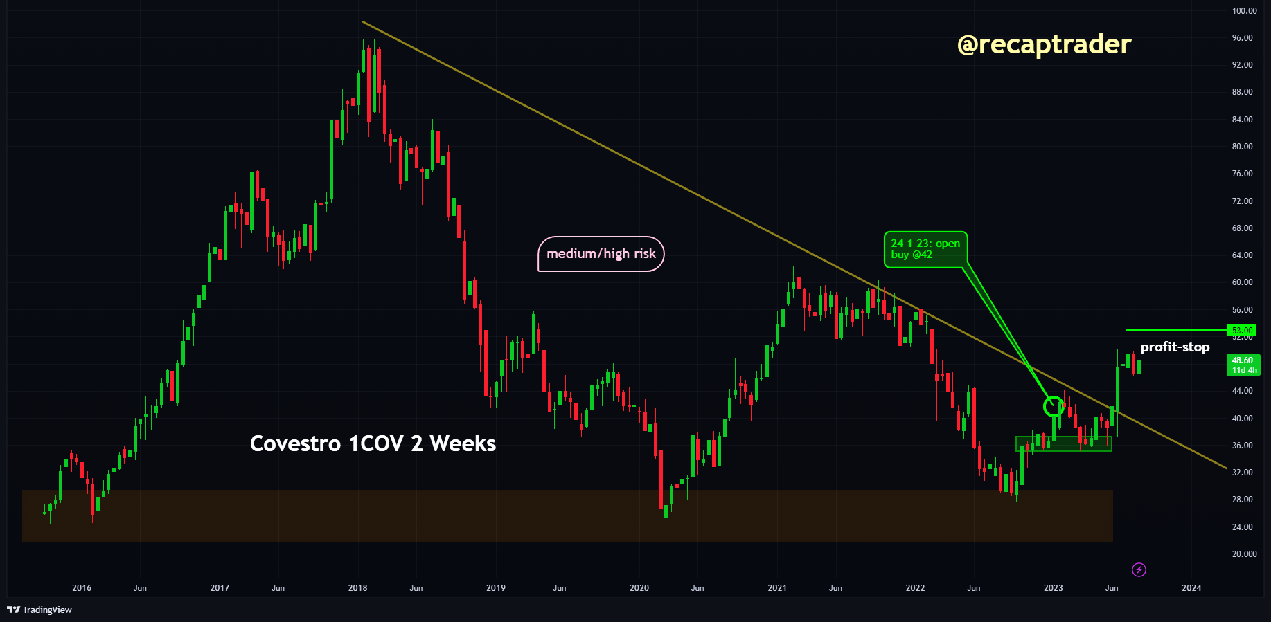We hebben een long en houden de positie vast met de verwachting dat de koers daadwerkelijk naar de 60 euro kan stijgen. We eerder hebben reeds aandacht besteed aan Covestro en het bod van ADNOC.