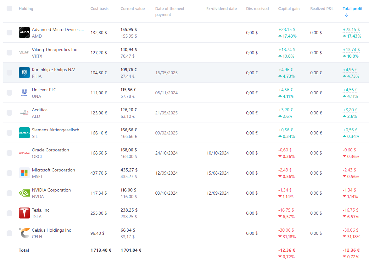 Tesla, waar we momenteel een verlies van 6% op hebben, blijft een sterke keuze vanwege hun ontwikkelingen in humanoïde robots. Bedrijven zoals Philips en Unilever zien we als stabiele keuzes voor de toekomst.