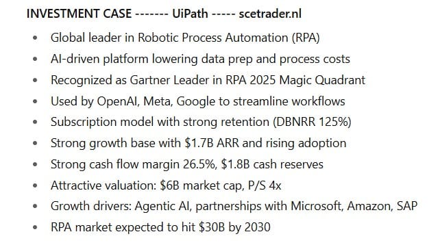 UiPath combineert marktleiderschap, sterke cashflow en een aantrekkelijke waardering met duidelijke groeikatalysatoren. Ondanks concurrentierisico’s en vertraagde winstgevendheid zien wij dit als een aantrekkelijk instapmoment. Wij gaan UiPath kopen.