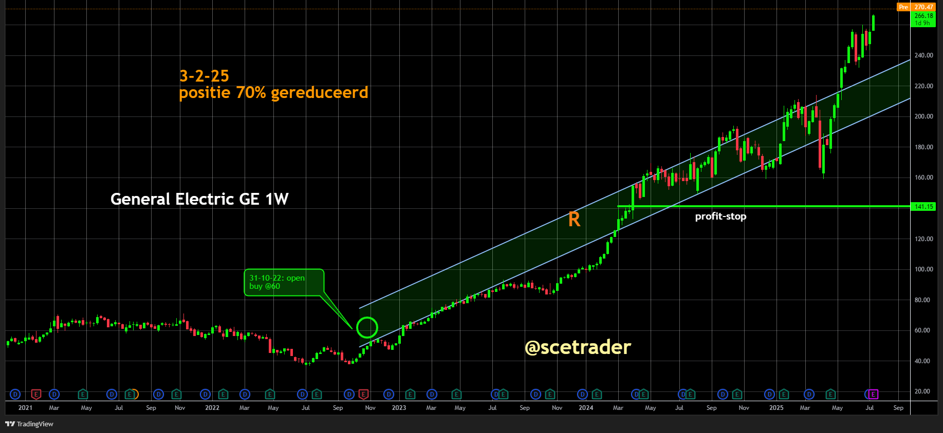 We blijven op een stijging van het aandeel GE Aerospace zitten en beschouwen het als een strategische kernpositie binnen onze portefeuille. We zaten er uitstekend bij: in 2022 kochten we het aandeel vrijwel exact op de bodem, mede dankzij overtuiging, een goed onderbouwde visie en een beetje geluk. Zie ook de database.