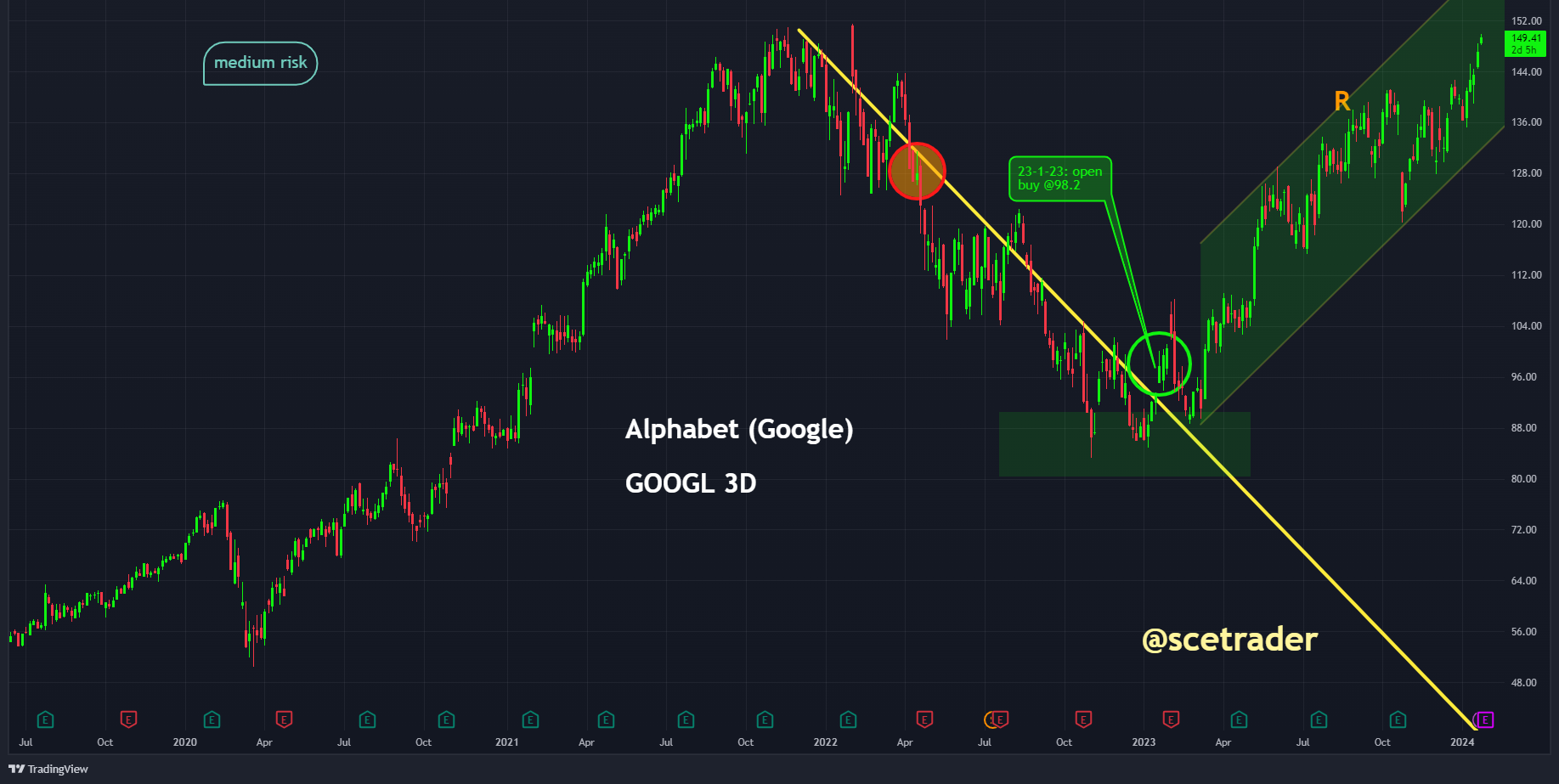 Het aandeel Alphabet $GOOGL heeft zojuist een nieuw all-time high bereikt. We hebben eerder vandaag al aandacht besteed aan het aandeel en het bedrijf. Vanaf de $98,2 zitten we op een up. De prijs gedreven actie van het aandeel is sterk