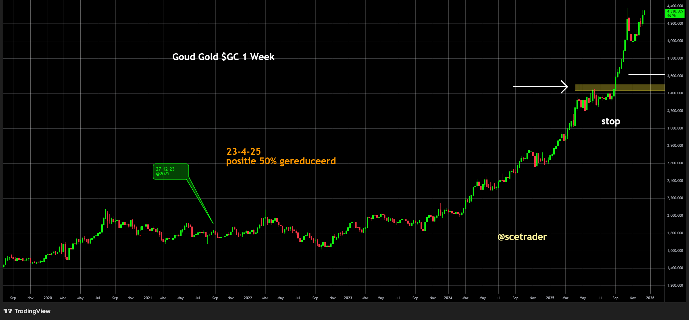 Voor nu geldt dat wij tevreden zijn met de positie en de gekozen opzet. Het is wel mogelijk dat de stop de komende periode verder wordt verhoogd om opgebouwde winst te beschermen. Goud test op dit moment haar all time highs. Een overtuigende doorbraak boven dit niveau kan het startpunt zijn van een nieuwe, krachtige rally. Uiteraard zijn er geen garanties, maar de combinatie van technische structuur en marktexpectaties rechtvaardigt dat wij op een stijging blijven zitten.