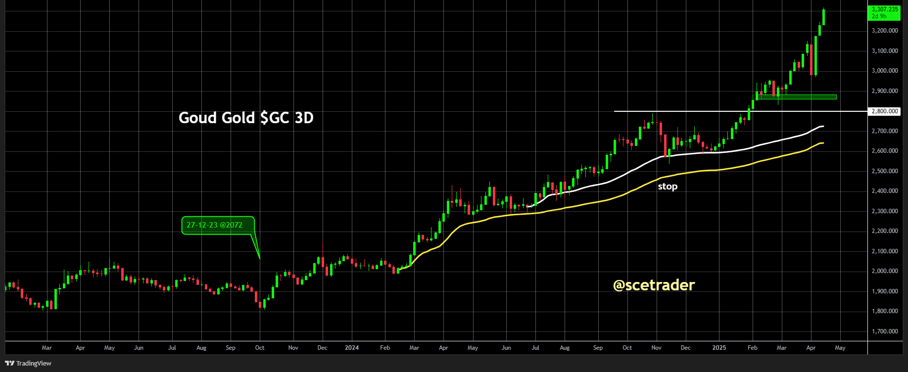 De goudprijs [gold] $GC heeft een nieuw record bereikt. Wij zitten sinds december 2023 vanaf $2072 op een stijging en houden onze positie vast. Of goud in een rechte lijn verder stijgt, valt te bezien. Meestal volgt op een parabolische beweging uiteindelijk een neerwaartse reactie.