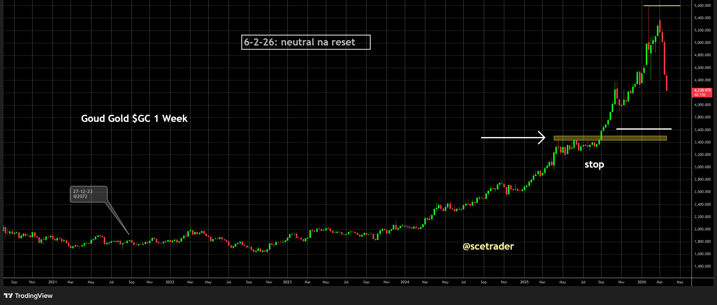 Wij zijn eind 2023 rond 2072 dollar ingestapt in goud en wij hebben in februari grote winst genomen. Inmiddels blijven wij bewust weg uit goud. Het boek is gesloten en de gerealiseerde winst staat stevig.