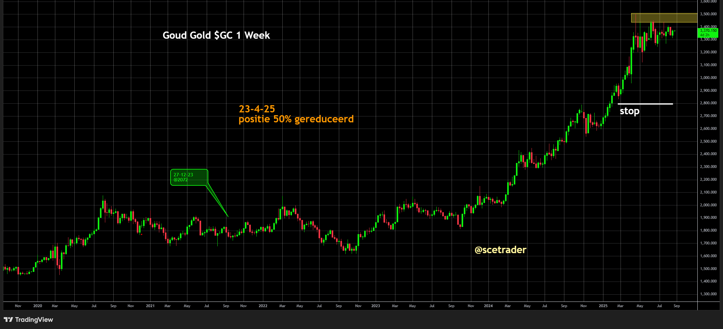 De koers van goud loopt echter al maanden tegen een zware weerstand aan, rond de 3.450 dollar. Deze gele zone op de grafiek blijkt tot nu toe te sterk om te doorbreken, waardoor de opwaartse beweging stokt.