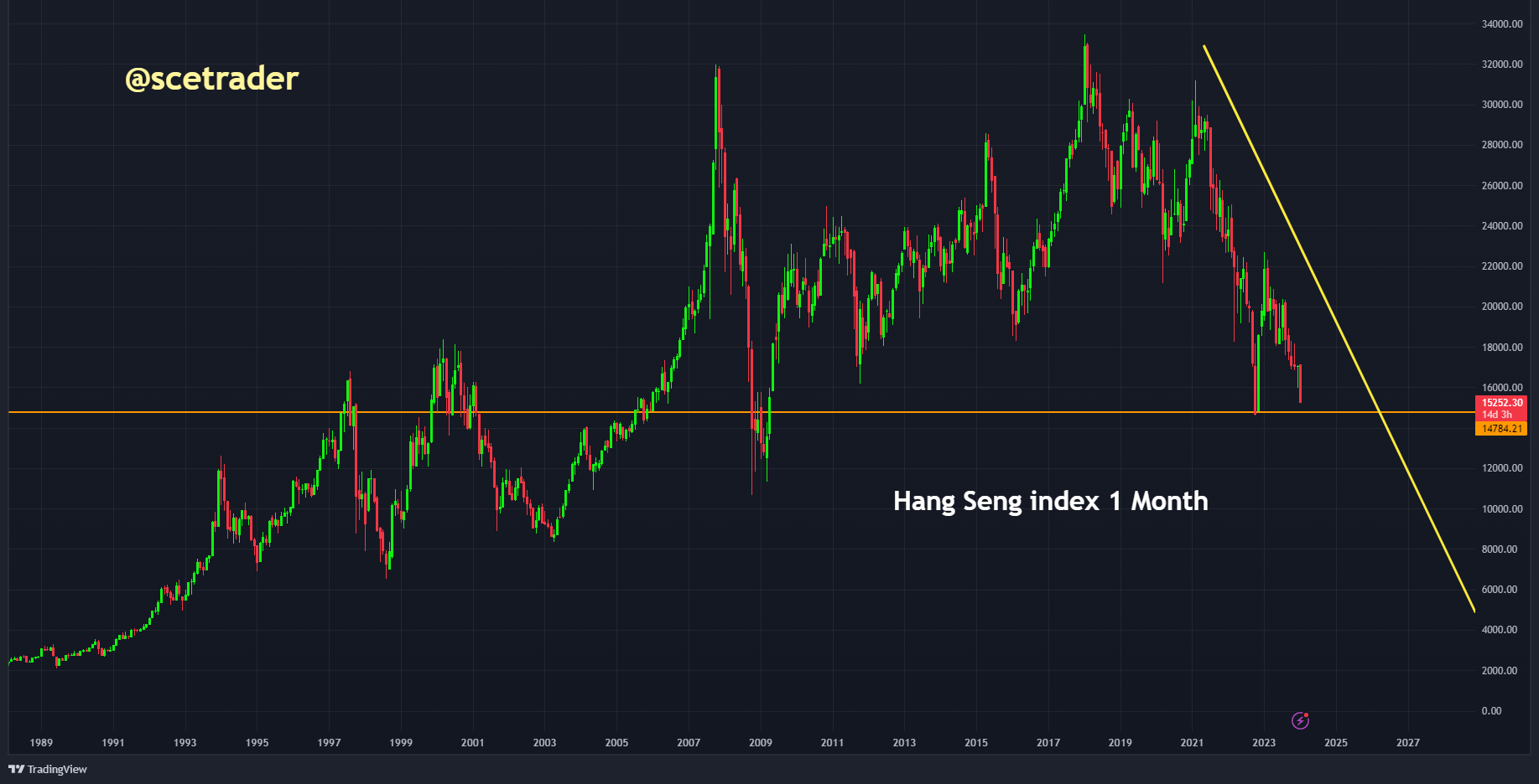 Op basis van een lange grafiek is zichtbaar dat de enige hoop voor de Hang Seng-index is dat een langere support stand zal houden. Dat is momenteel nog onduidelijk.