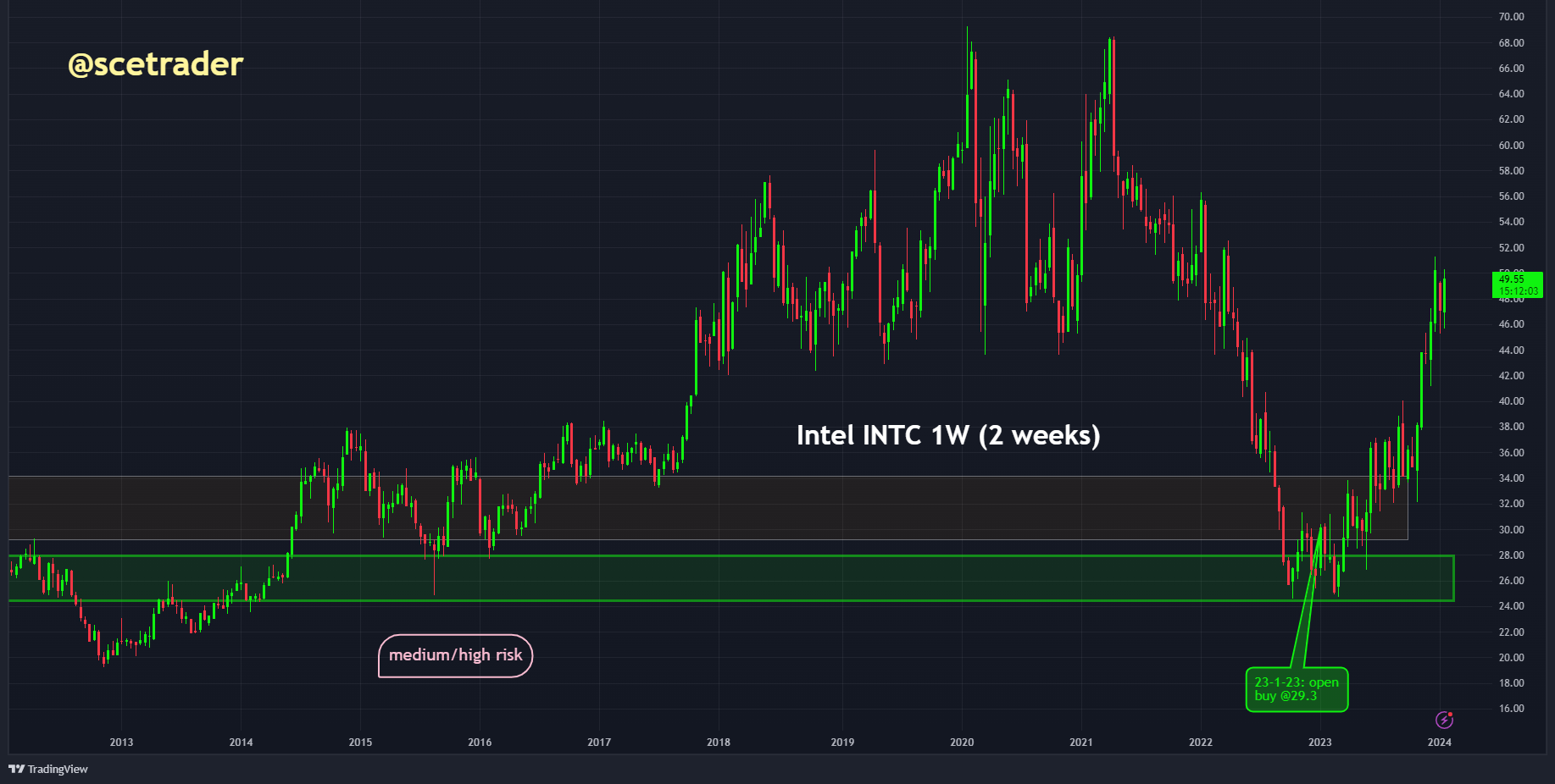Ook willen we erop wijzen dat Intel in de loop van 2024 juist wel eens de verwachtingen kan gaan verhogen. Dit heeft te maken met een natuurlijke vervangingsvraag voor pc's. Deze opwaartse cyclus wordt verwacht in het derde of vierde kwartaal van 2024. Dit kan voor een aanzienlijke vraag zorgen naar producten van Intel.
