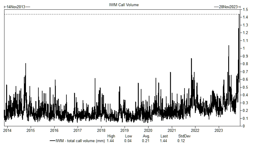 Handelaren kopen een recordaantal call-opties op de Russell 2000 ETF $IWM, zo blijkt uit gegevens van Goldman Sachs. Dit betekent dat investeerders in toenemende mate wedden op een stijging van de Russell 2000-index.
