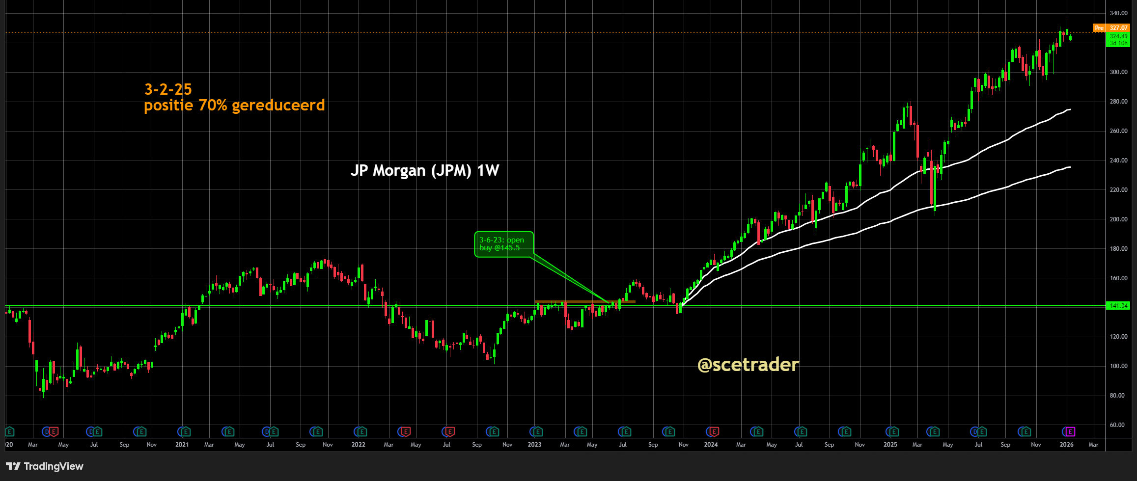Wij zitten al langere tijd op een stijging van het aandeel JPMorgan Chase en staan duidelijk in de winst. De cijfers over het vierde kwartaal bevestigen onze overtuiging dat dit één van de sterkste en best gepositioneerde banken wereldwijd is. Wij blijven bullish op het aandeel en zien deze resultaten als een bevestiging van de onderliggende kwaliteit van het verdienmodel.