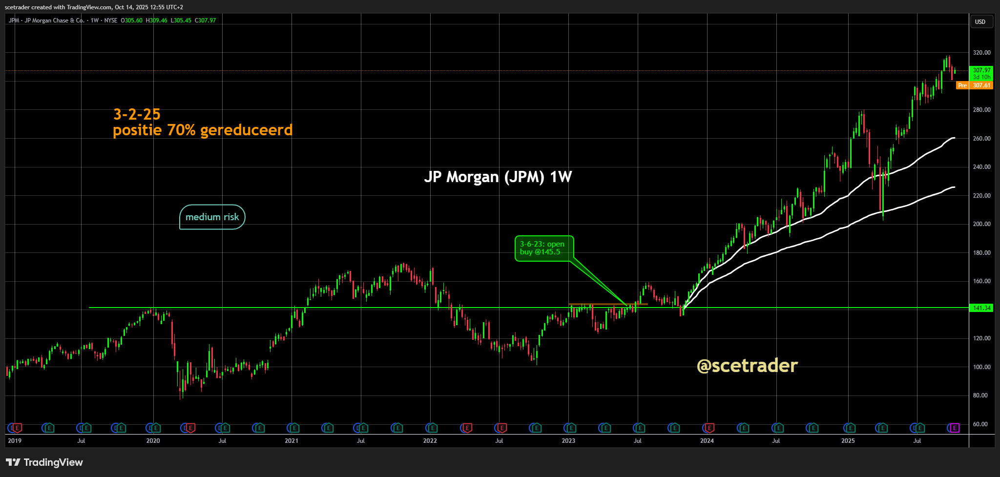 Wij hebben JPMorgan gekocht op 145,50 dollar en blijven op een stijging zitten. De combinatie van sterke winstgroei, een gezonde balans en duidelijke strategische richting maakt het aandeel aantrekkelijk voor de langere termijn.