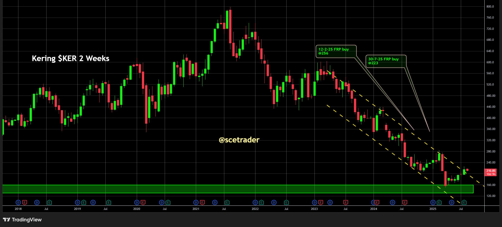 We beginnen met de chart. De chart van Kering oogt nog steeds zwak. Een serieuze uitbraak uit het neerwaartse trendkanaal is tot nu toe niet gelukt. Dat betekent dat er nog altijd een risico bestaat dat de koers opnieuw afglijdt naar lagere niveaus. Het hoeft niet per se te gebeuren, maar het is wel iets waar beleggers rekening mee moeten houden.