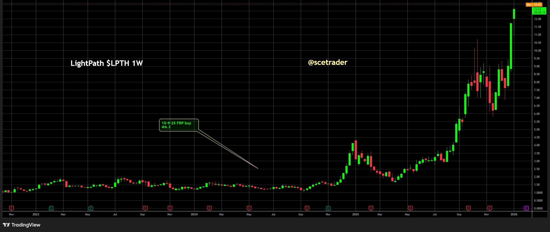 LightPath Technologies $LPTH is een positie die wij eerder hebben opgebouwd op duidelijk lagere niveaus. Zie ook de database. De huidige koers betekent dat wij inmiddels in een gezonde winstpositie zitten. Dat geeft rust en bevestigt dat de oorspronkelijke analyse en timing juist waren.