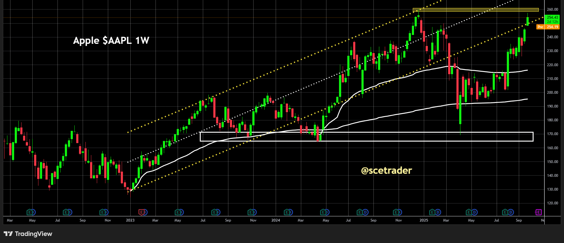 Apple hebben wij gemist in de recente opwaartse beweging (zie ook de database). Wel hebben wij indirecte blootstelling via onze positie in Berkshire Hathaway. Het aandeel nadert nu de oude top van december 2024.