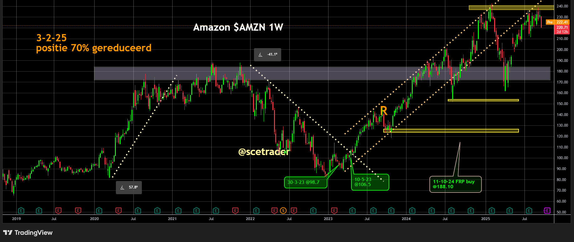 We also trimmed our Amazon holding. The early 2025 peak remains a strong resistance level.