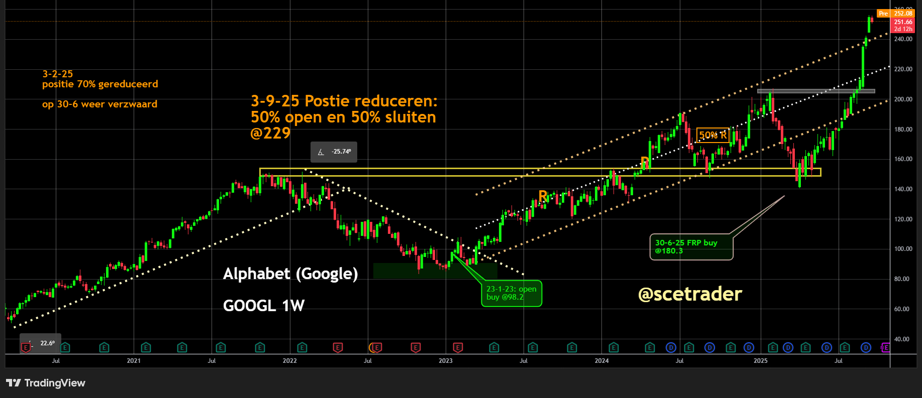 Op Alphabet hebben wij een forse winst. Op 30 juni kochten we bij op 180,30 dollar en op 3 september hebben we de positie gehalveerd.
