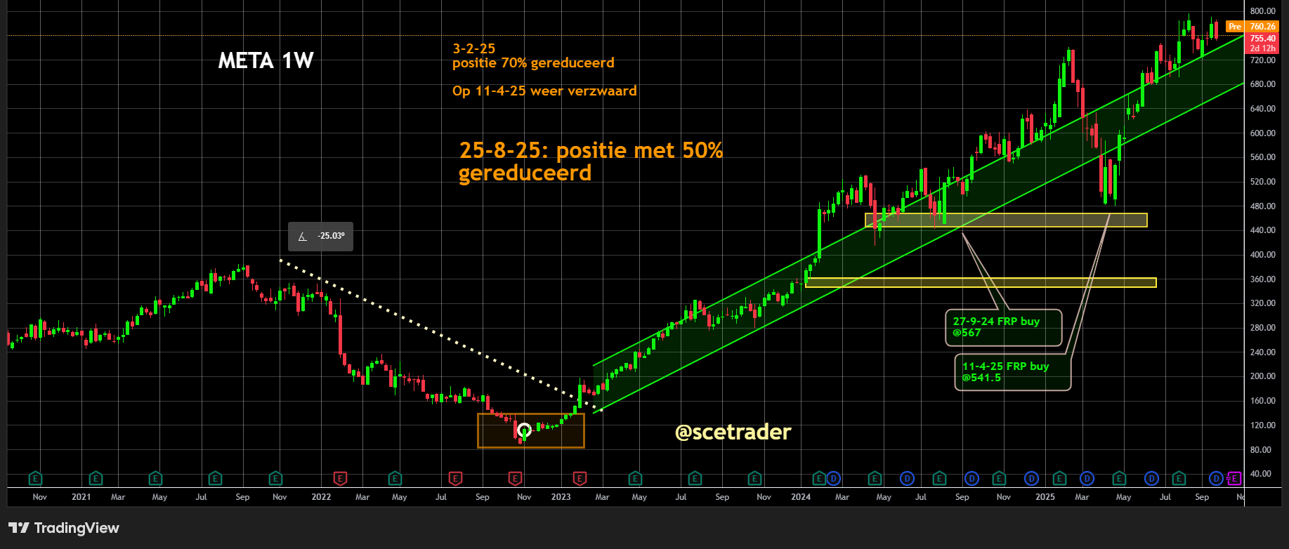 Meta hebben wij na de laatste kwartaalcijfers gehalveerd. Hoewel de markt positief reageerde, vinden wij dat er kunstmatig met afschrijvingen is geschoven (zie de database). Dat wordt nu genegeerd, maar kan later alsnog invloed hebben.