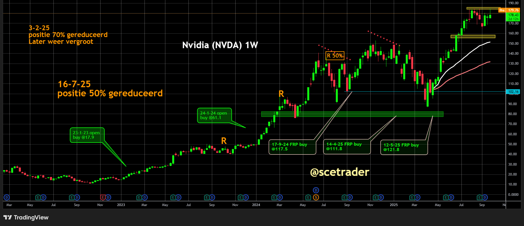 Wij zitten nog altijd op een stijging in NVIDIA. De positie is echter op 16 juli verkleind en we zijn niet van plan om bij te kopen. Sinds onze eerste aankoop op 17,90 dollar in deze cyclus is NVIDIA uitgegroeid tot een van de grote winnaars. Zie ook de database.