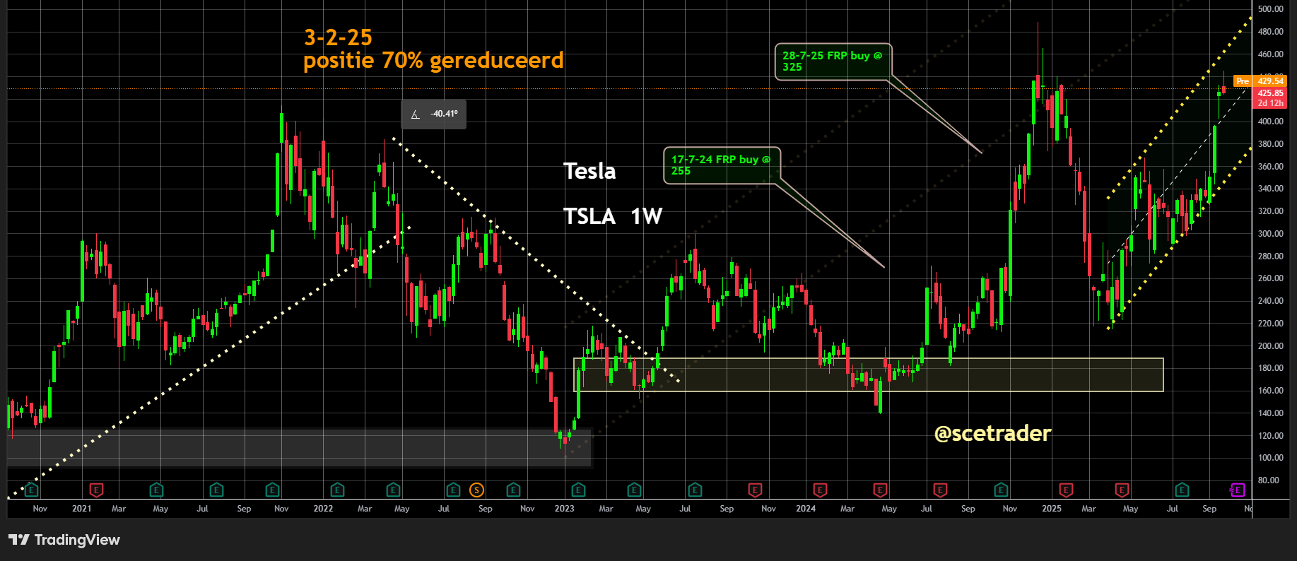 Tesla heeft sterk gepresteerd, wat ons goed uitkomt na onze aankoop op 28 juli op 325 dollar. Wij zien Tesla als een uniek aandeel dat vaak forse koersschommelingen laat zien. Zie ook de database.