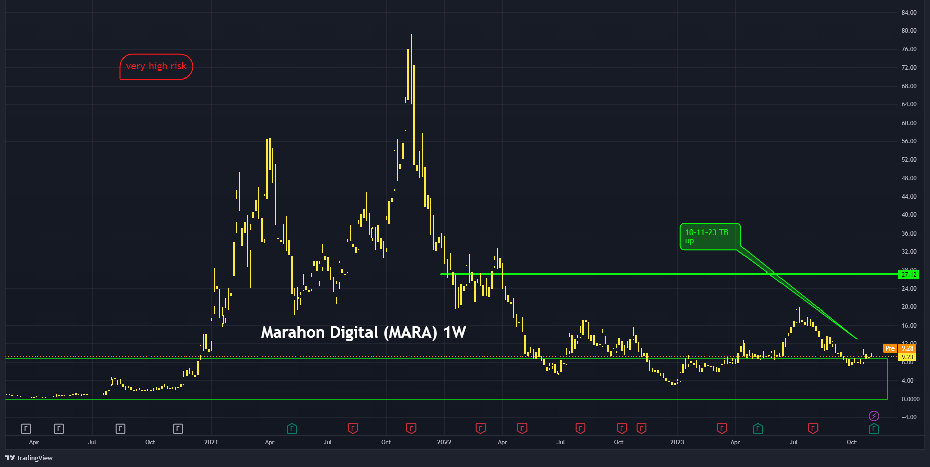 Bitcoin miner Marathon Digital Holdings [Marathon] $MARA presenteerde eerder deze week indrukwekkende resultaten. Als de koers vandaag rond het huidige niveau de officiële handel gaat beginnen, gaan we een kleine positie innemen in het high-risk gedeelte.