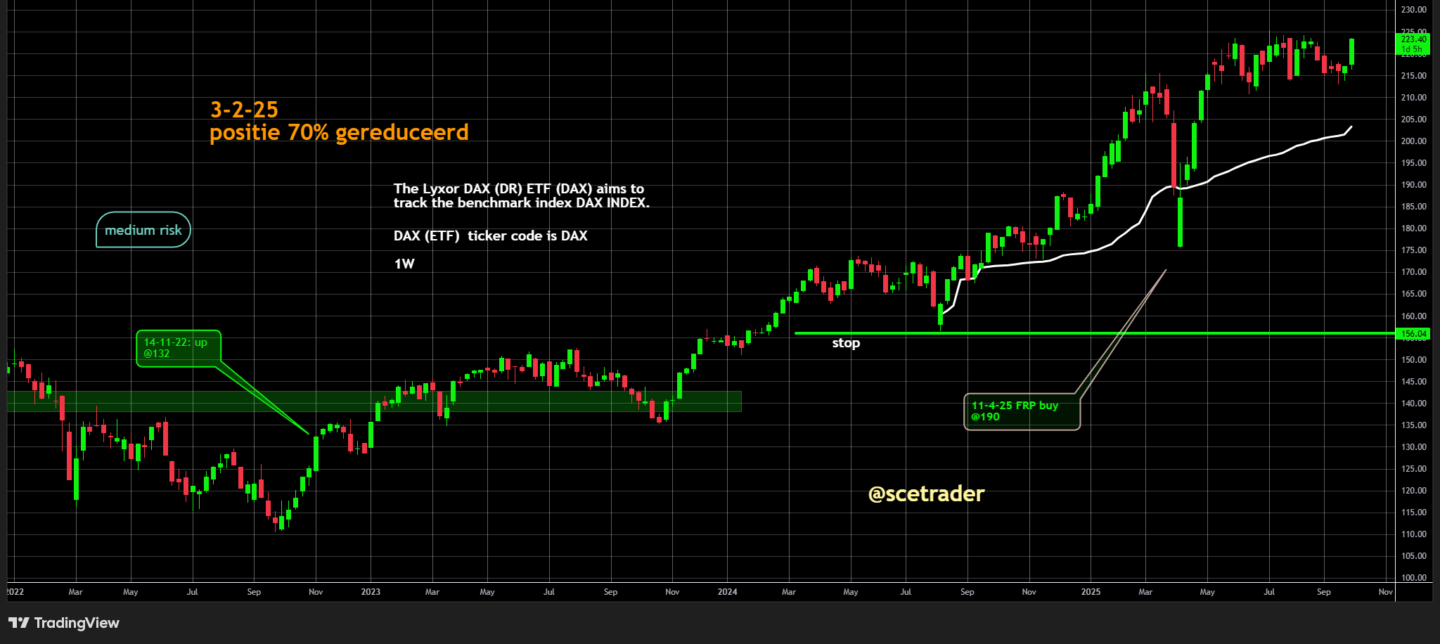 Wij hebben een VWAP ingetekend die momenteel rond de 203 euro ligt. Dat niveau correspondeert met een vergelijkbare stand van de DAX zelf. Pas wanneer de koers dat niveau nadert, zullen wij mogelijk overwegen om een deel van de positie af te bouwen. Tot die tijd houden wij vast aan onze opwaartse strategie.