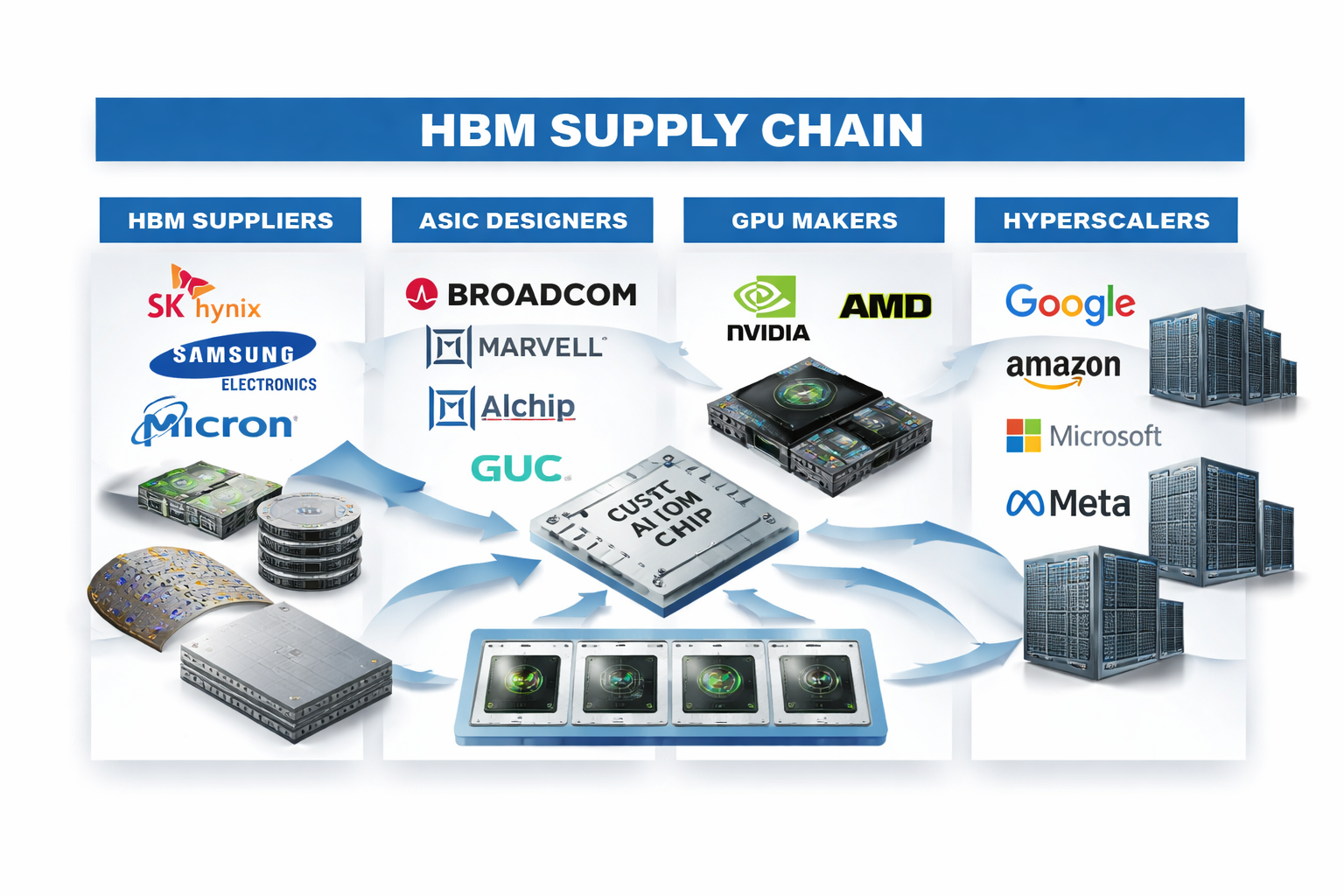 Between memory producers and end customers sits a critical but often underappreciated layer: ASIC designers. Companies such as Broadcom, Marvell, Alchip, and GUC design custom AI silicon for hyperscalers and large enterprises.