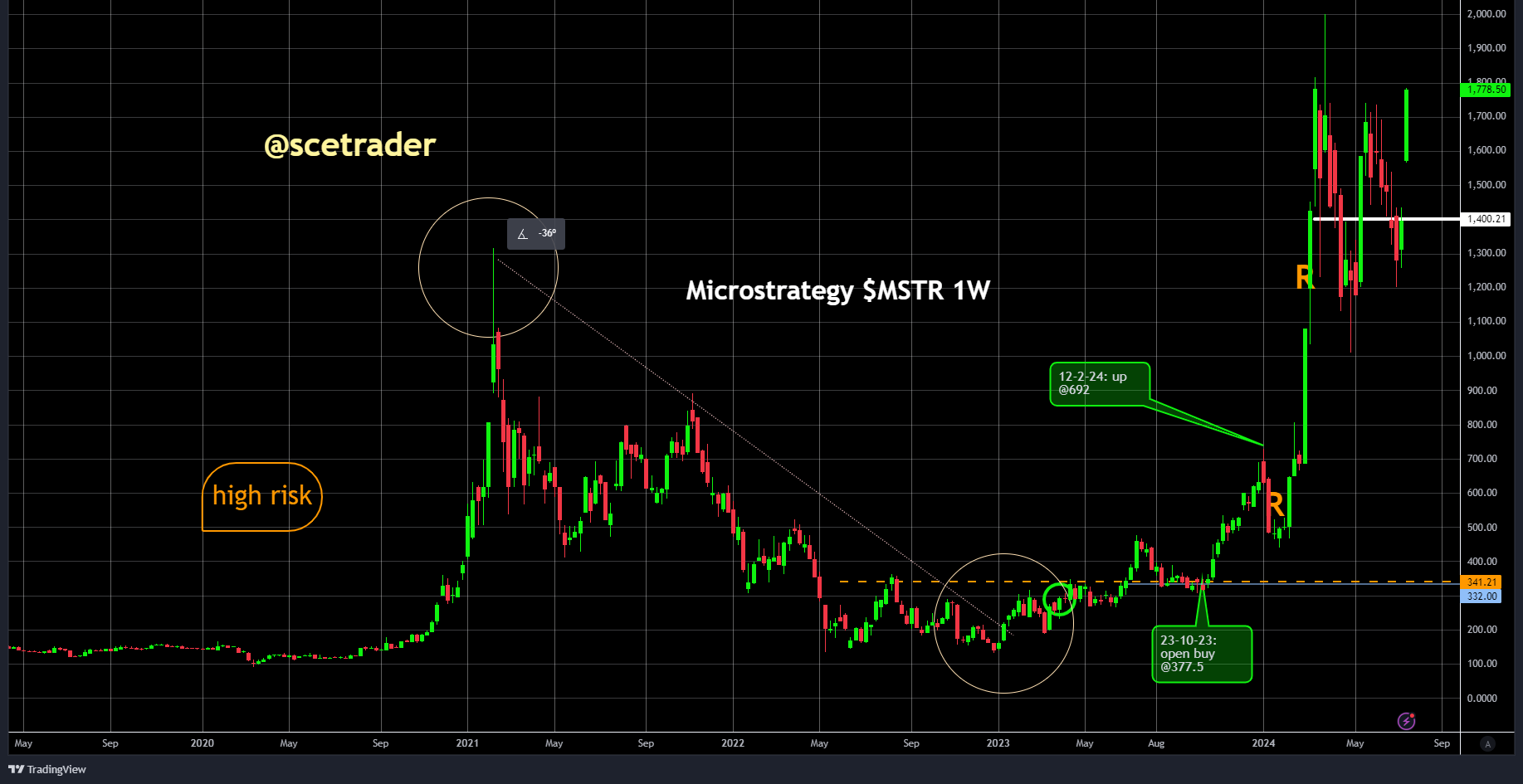 De koers van MicroStrategy $MSTR heeft opnieuw een flinke spike laten zien. Dit is in lijn met de stijging van Bitcoin en de hoop dat Trump de verkiezingen gaat winnen onder crypto beleggers en het feit dat de aandelen 1 op 10 gesplitst gaan worden.
