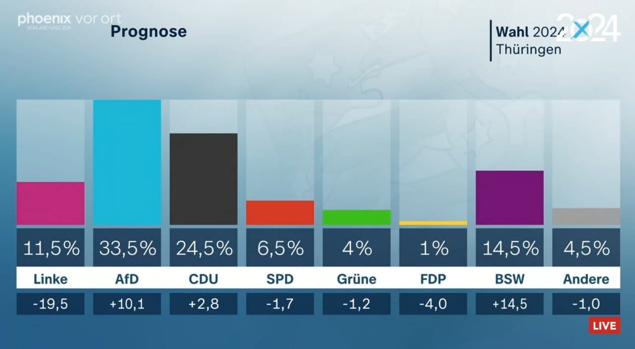 Volgens exitpolls, zoals na 18.00 uur gisteren werd vrijgegeven stond de rechts-populistische partij Alternative für Deutschland (AfD) op het punt om voor het eerst een deelstaatverkiezing in Duitsland te winnen. Dat bleek ook zo te zijn bij de tellingen. Dit is een aardverschuiving voor de politiek, nu de afgelopen jaren de Afd steeds meer steun heeft gekregen in verschillende regio's van het land. Volgens politieke experts weerspiegelt de overwinning van de Afd een groeiende onvrede onder bepaalde kiezersgroepen, vooral over kwesties als immigratie en EU-beleid. Deze ontwikkeling kan gevolgen hebben voor het politieke landschap in Duitsland en de traditionele partijen uitdagen op deelstaatniveau.
