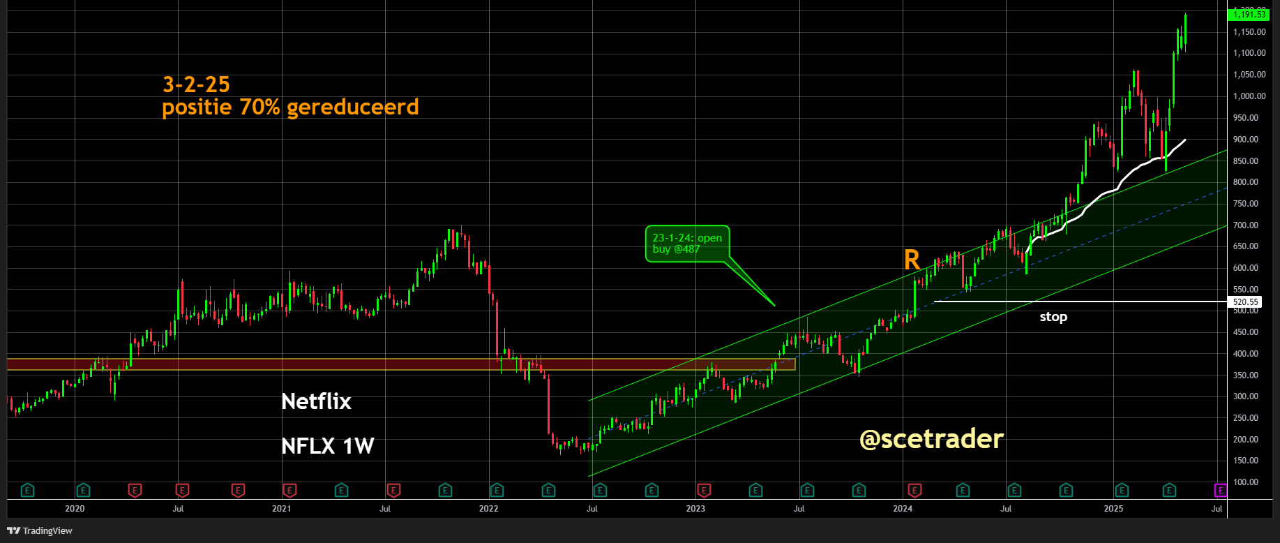 Wij zitten al enige tijd op een stijging van het aandeel Netflix en blijven dit met overtuiging vasthouden (positie eerder gereduceerd als een free ride). De chart bevestigt ook het positieve sentiment.