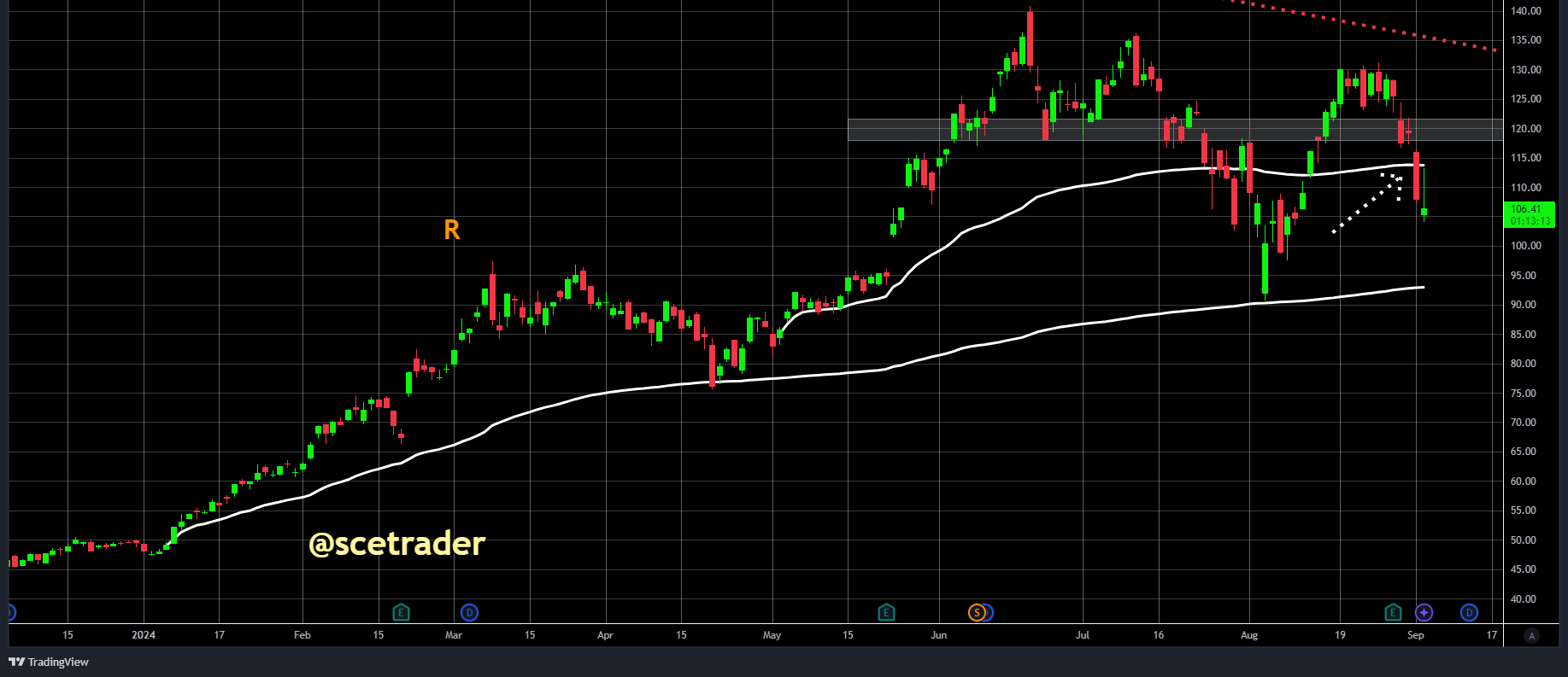 De koers van NVIDIA ketst af op de hoogste VWAP en sindsdien is NVDA weer gedaald. Dit is een klassiek patroon en zou erop kunnen wijzen dat de tweede VWAP (onderste witte lijn), nu rond de 93 dollar, getest kan worden. De verkopers zijn dus nog steeds in controle.