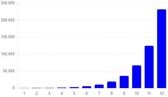 Op hypothetische basis, als een stijging van 3,5% elke dag zou plaatsvinden, kunnen we een grafiek maken om te illustreren wat er zou gebeuren met de koers van NVIDIA na 12 maanden, uitgaande van 21 handelsdagen per maand.