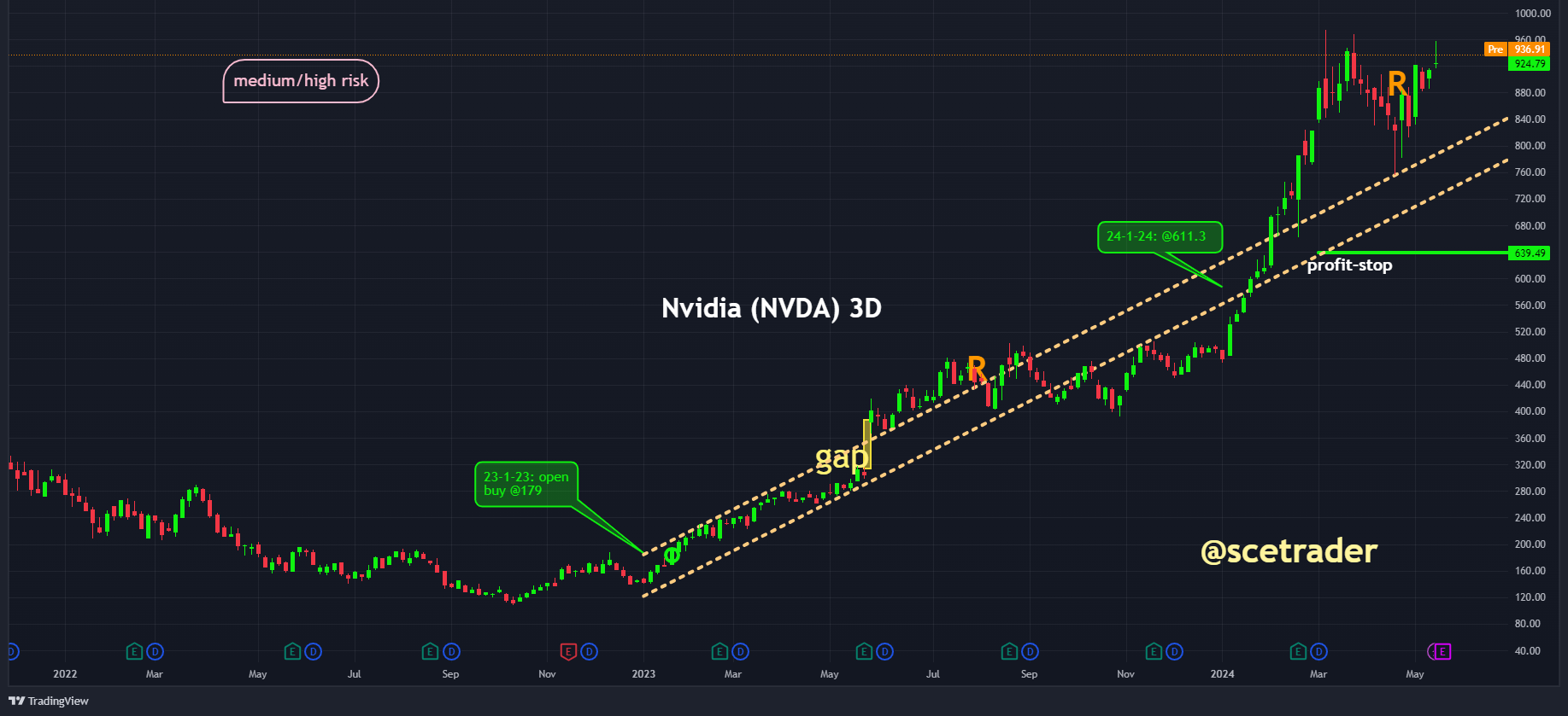 Sinds januari 2023 zitten we op een stijging van NVIDIA vanaf 179 dollar. Hoewel we onze positie hebben gereduceerd om een free ride te hebben, blijven de vooruitzichten positief en houden de rest van onze positie vast. Het is nu afwachten of de resultaten aan de verwachtingen voldoen. De reactie van de markt zal afhangen van deze uitkomst.