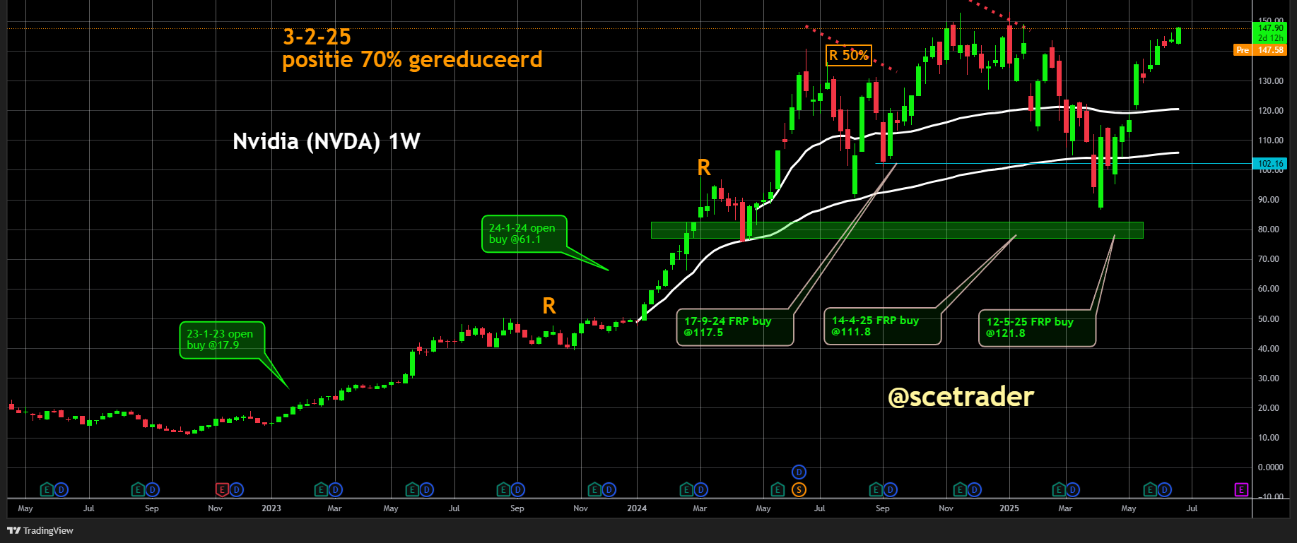 We blijven op een stijging van het aandeel NVIDIA zitten. We sluiten zelfs niet uit dat het aandeel binnenkort probeert uit te breken naar nieuwe records. Een doorbraak zou niet alleen het aandeel zelf omhoog trekken, maar mogelijk ook de hele chipsector op sleeptouw nemen.