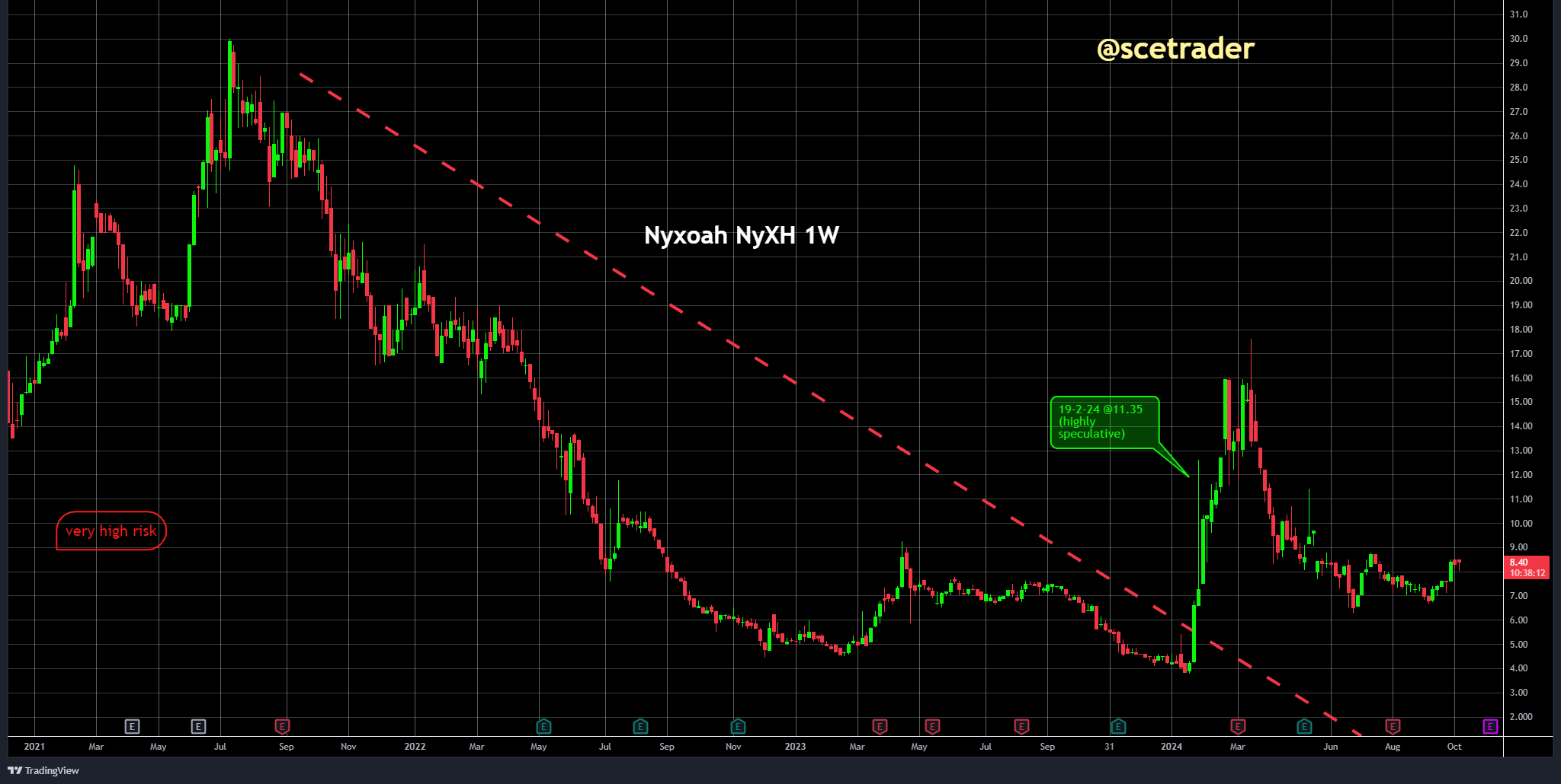 Het bedrijf zit nog in een onzekere fase. We hebben nog steeds een gokkers-positie in het aandeel. Mocht Nyxoah echt doorbreken in de Amerikaanse markt, zou dat een grote stap voorwaarts zijn en mogelijk leiden tot een veel hogere koers. Op de korte termijn hebben we geen idee wat de koers zal doen, en zelfs een scenario waarin het aandeel naar nul gaat, is nooit uitgesloten bij dit soort start-ups.