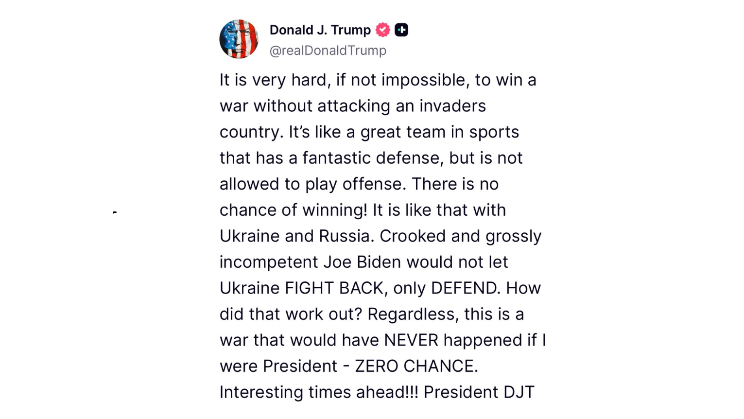 In zijn boodschap gebruikte Trump een sportmetafoor: een team dat alleen mag verdedigen en niet mag aanvallen kan nooit winnen. Daarmee doelt hij op het huidige beleid, waarin Oekraïne vooral defensieve middelen kreeg zoals luchtverdedigingssystemen en beperkte langeafstandswapens.