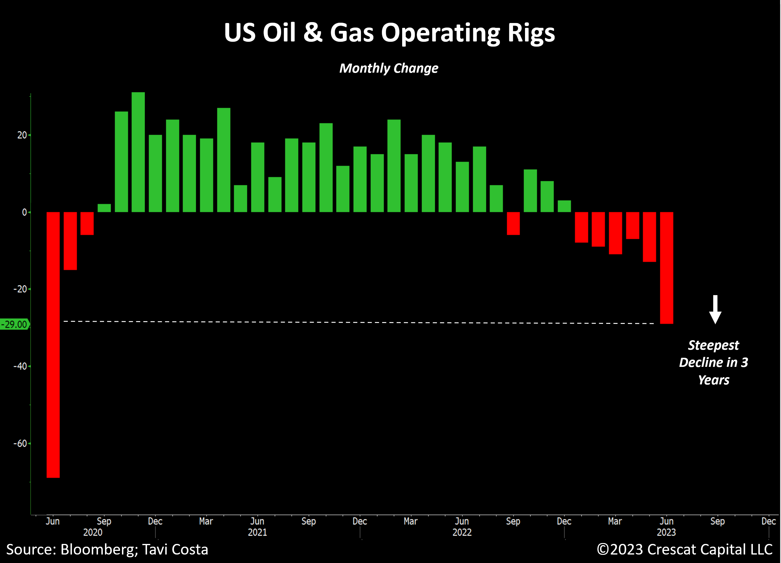 Otavio (Tavi) Costa van Crescat Capital schrijft dat energiebedrijven hebben gemeld dat het aantal operationele boorinstallaties (operating rigs) de scherpste daling in 3 jaar heeft doorgemaakt.