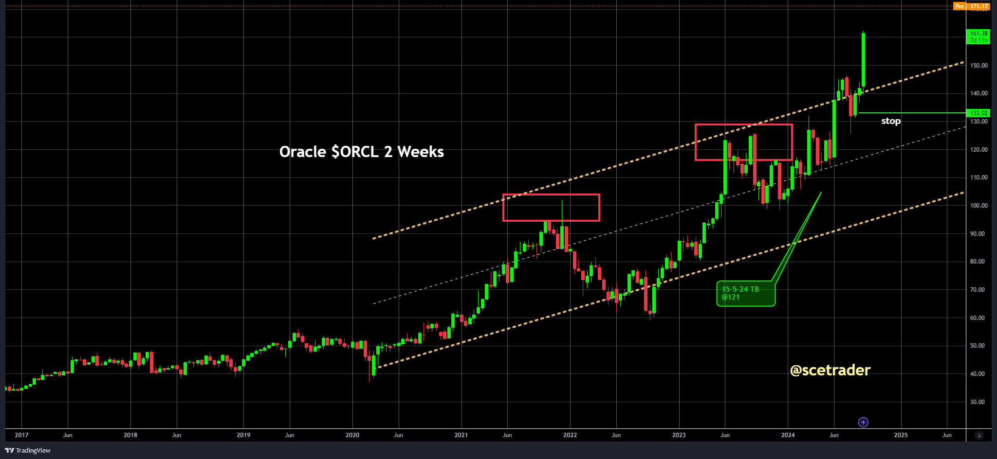 Dit komt ook door een bericht van OpenAI dat met een nieuwe versie komt, O1, en zegt dat het nog grotere uitdagingen daarmee kan oplossen dan die we tot nu toe meemaakten. Dit is bullish voor Oracle, dat namelijk zaken doet met OpenAI en met Microsoft.