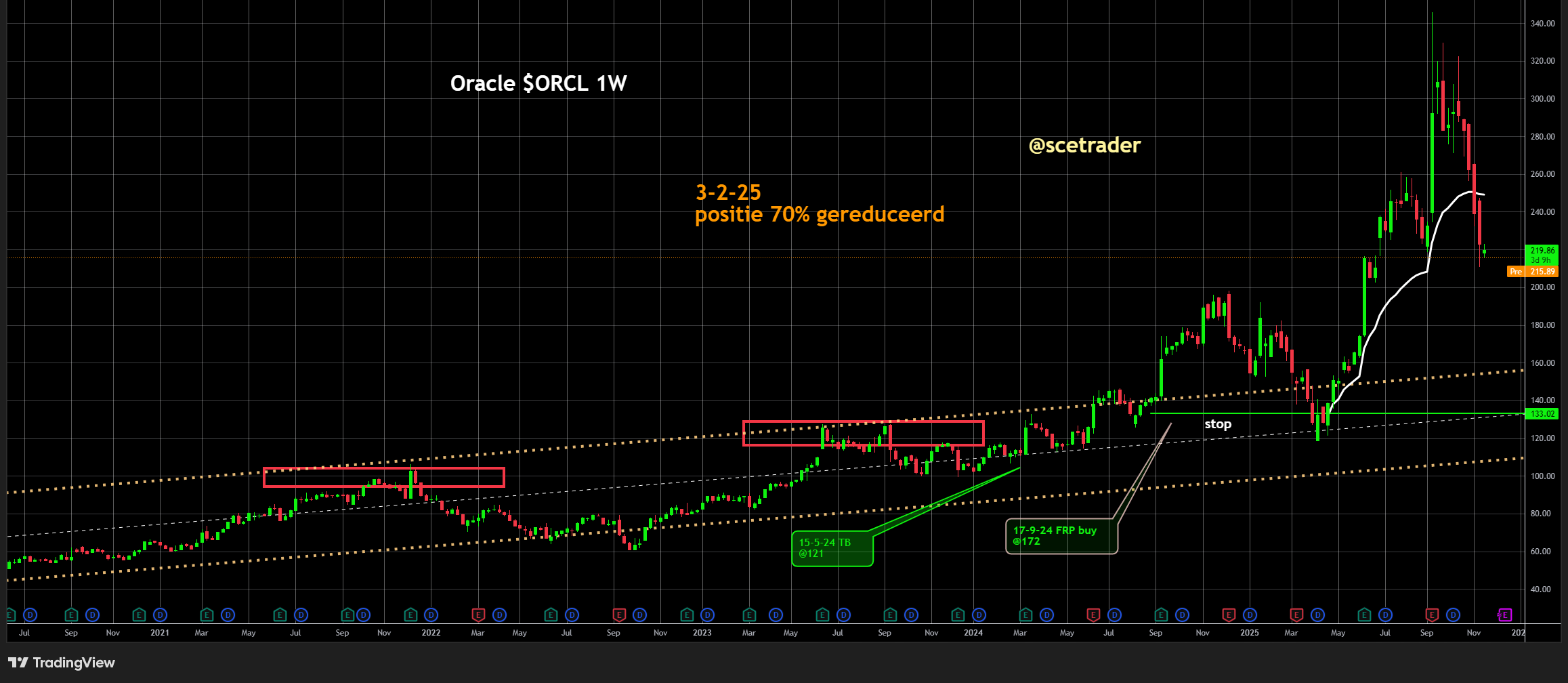 Wij hebben op dit moment een kleine positie in het aandeel Oracle. Wij kopen niet bij. Wij hebben eerder al gewezen op de risico’s rondom het in de markt zetten van een megastructuur van leningen waarvan omvang, tijdspad en bereidheid van kredietverstrekkers nog altijd onduidelijk zijn.