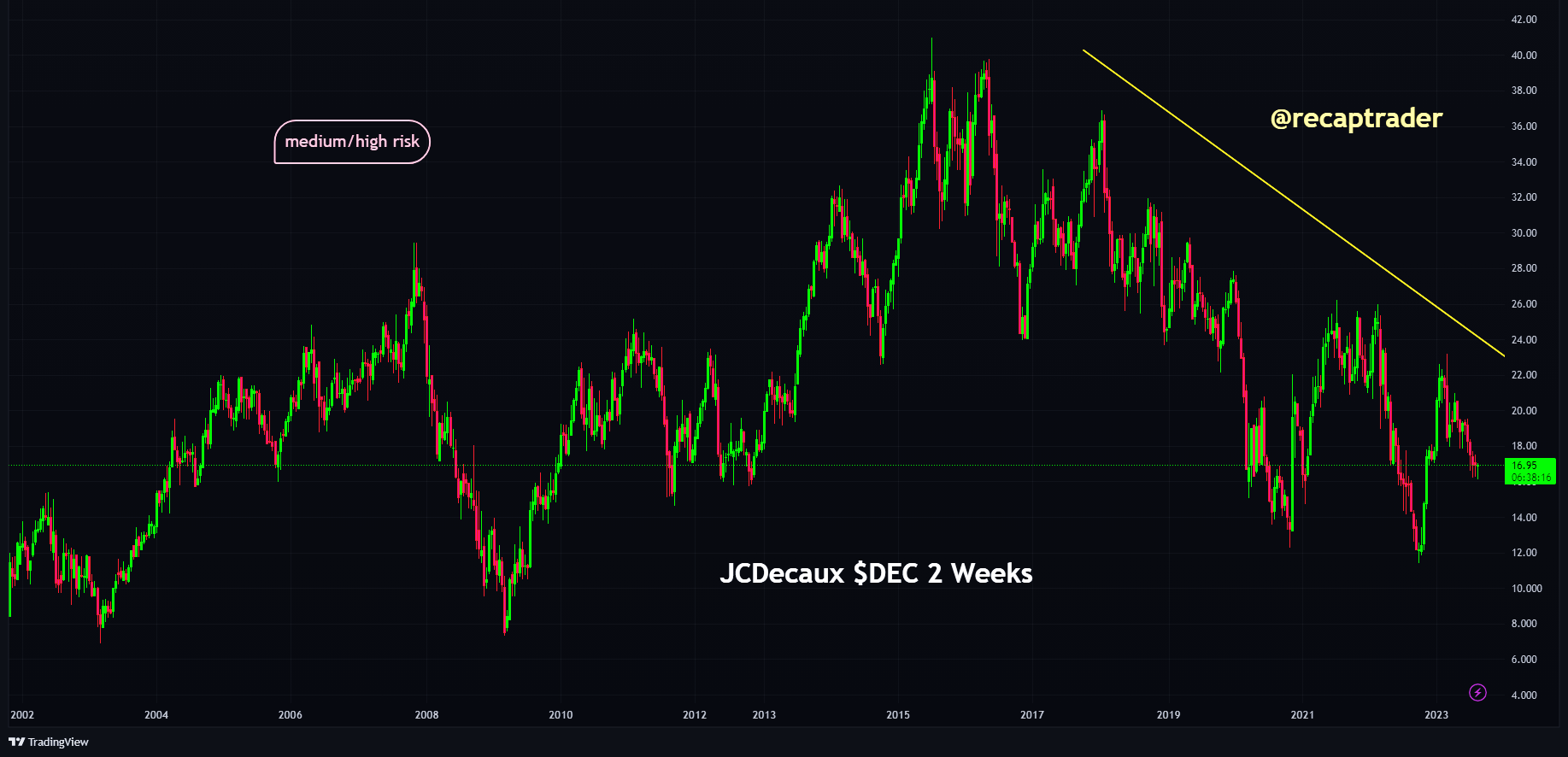 Terwijl we zelf momenteel geen actie ondernemen met JCDecaux $DEC zien we de visie van Deutsche Bank (DB) als stof tot nadenken. Misschien als de prijs gedreven actie beter wordt gaan we "meedoen" met de broker en als trading buy ook kopen. Nu doen we dat niet gezien de dalende trend van het aandeel.
